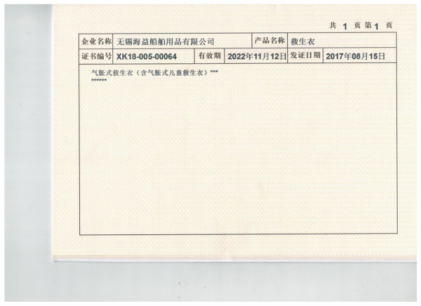 公司專業(yè)生產(chǎn)氣脹式救生衣、工作救生衣、救生圈、救生衣燈等產(chǎn)品的開發(fā)與制造;以上產(chǎn)品具有強(qiáng)度高、性能優(yōu)、體積小、重量輕、環(huán)保且簡(jiǎn)單易用等優(yōu)點(diǎn),適用于專業(yè)船用救生、軍用、也可用于休閑救生的領(lǐng)域。公司建立了完善的質(zhì)量保證體系,產(chǎn)品嚴(yán)格按照SOLAS、LSA、Code和ISO12402等最新的國(guó) 際規(guī)范要求進(jìn)行研制、試驗(yàn)、生產(chǎn)和檢驗(yàn)。